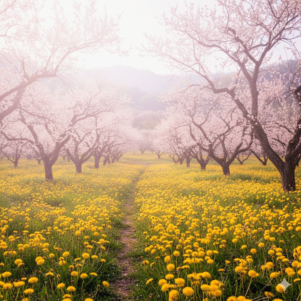 梅の木の下で、たんぽぽに囲まれて、